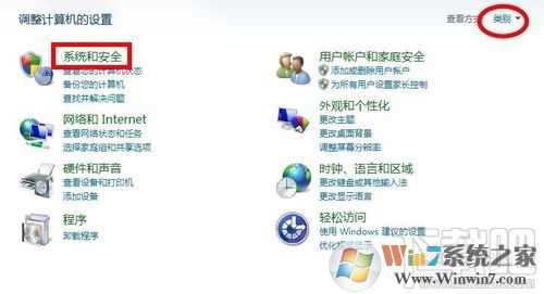 2、打開“調(diào)整計(jì)算機(jī)設(shè)置”窗口中的“系統(tǒng)和安全選項(xiàng)”對(duì)話框,如果在窗口中找不到選項(xiàng),可以點(diǎn)擊右側(cè)類別旁邊的下拉按鈕,選擇“類別”即可顯示;