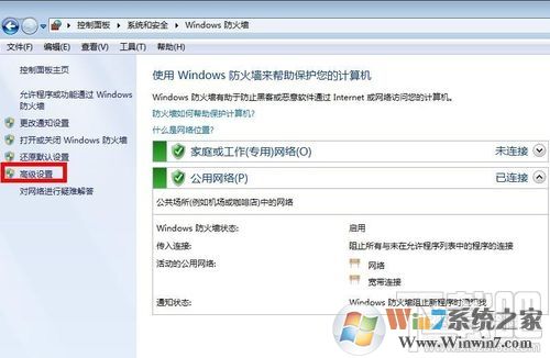 4、在打開的“Windows防火墻”對(duì)話框中點(diǎn)擊左側(cè)的“高級(jí)設(shè)置”;