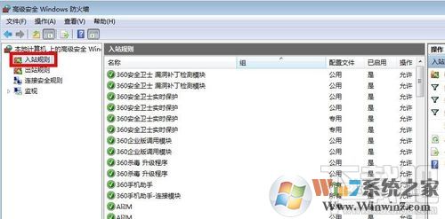 10、然后點(diǎn)擊入站規(guī)則就可以顯示之前設(shè)置的規(guī)則了,說明135,137,138,139,445等端口關(guān)閉已經(jīng)生效了。