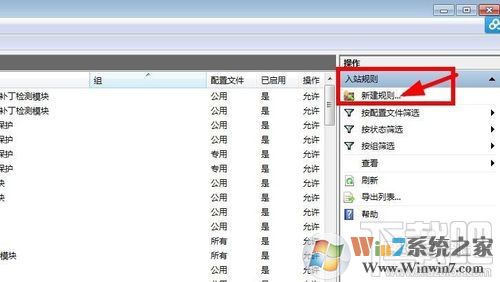 5、點(diǎn)擊對(duì)話框左側(cè)的“入站規(guī)則”,然后點(diǎn)擊右側(cè)的“新建規(guī)則”;