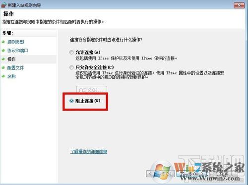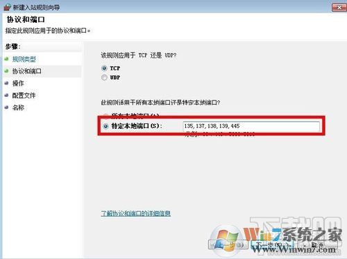 8、點(diǎn)擊下一步,選擇“特定本地端口”,輸入“135,137,138,139,445”,端口號(hào)中間用逗號(hào)隔開即可,選擇“阻止連接”,然后點(diǎn)擊下一步;