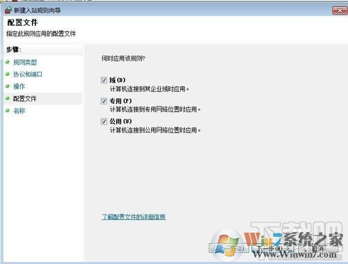 9、“域”“專用”“公用”都選上,點(diǎn)擊下一步,輸入“名稱”和“描述”即可,這里你可根據(jù)自己需要內(nèi)容自行決定,點(diǎn)擊完成,這個(gè)組織規(guī)則就創(chuàng)建完成了。