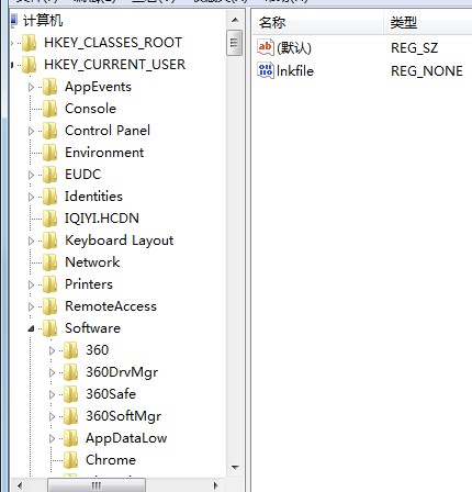 2、打開注冊(cè)表后在左側(cè)依次展開:HKEY_CURRENT_USER\SOFTWARE\MICROSOFT\WINDOWS\currentversion\Explorer\FileExts\.lnk;