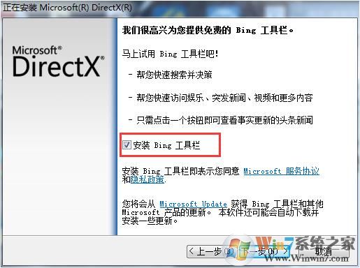 第三步,取消勾選“安裝Bing工具欄”,在出現(xiàn)的就窗口中直接點擊“下一步”,程序開始執(zhí)行安裝程序并拷貝文件到本地硬盤中;