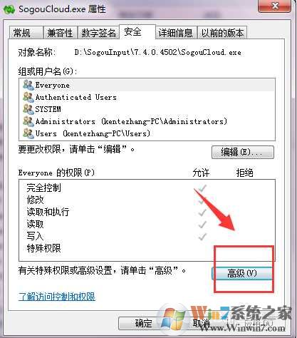 4、進(jìn)入SogouCloud.exe屬性,選擇安全項(xiàng)目,在安全項(xiàng)目everyone的權(quán)限下點(diǎn)擊高級(jí)。
