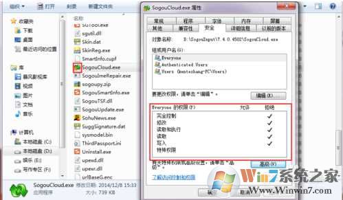 修改成功以后我們發(fā)現(xiàn)SogouCloud.exe程序圖標(biāo)左下角多了個(gè)黃點(diǎn),SogouCloud.exe屬性中everyone的權(quán)限已經(jīng)全部改為拒絕了。