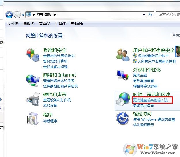 2、然后在打開的控制面板中,我們選擇更改鍵盤或其他輸入法這個(gè)選項(xiàng),如圖所示: