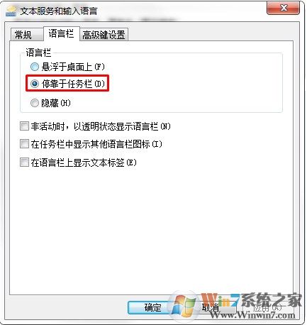 4、然后打開文本服務(wù)和輸入語言屬性窗口,我們切換到語言欄選項(xiàng)卡,如圖所示: