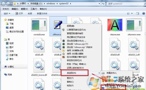 4、從上圖中可以看到我沒有Ctfmon這個(gè)選項(xiàng),可能是優(yōu)化過頭直接把其刪除了吧,那么我們就要使用下面這種方法了,我們打開C:\Windows\System32目錄下,找到一個(gè)名為Ctfmon.exe的程序,我們?cè)谶@個(gè)程序上面右鍵-然后選擇發(fā)送到,再選擇桌面快捷方式,如圖所示:
