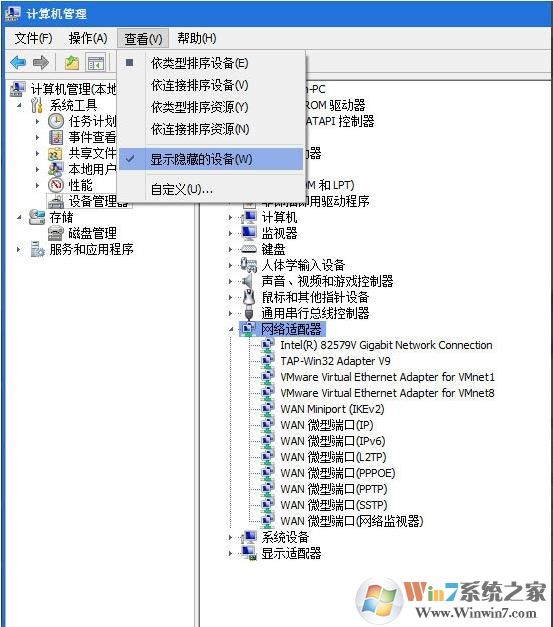 3、同時時也可以在設備管理器中刪除,在“設備管理器”中先在“查看”菜單中選擇“顯示隱藏的設備”,然后在網(wǎng)絡適配器中可以看到很多6to4 Adapter或者isatap Adapter的隧道適配器,刪掉所有這些,可是一個個刪實在是太痛苦,所以還是用上面的方法吧。最后CMD里ipconfig命令下,如果只有以太適配器和無線適配器(如果你有無線網(wǎng)卡),那么就說明你已經(jīng)刪除干凈了,重啟電腦即可。