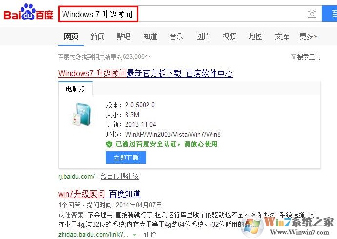 請到百度下載免費軟件 Windows 7 升級顧問。該軟件可找出電腦硬件、設(shè)備或程序中可能會影響 Windows 7 安裝的潛在問題,并給出操作建議。