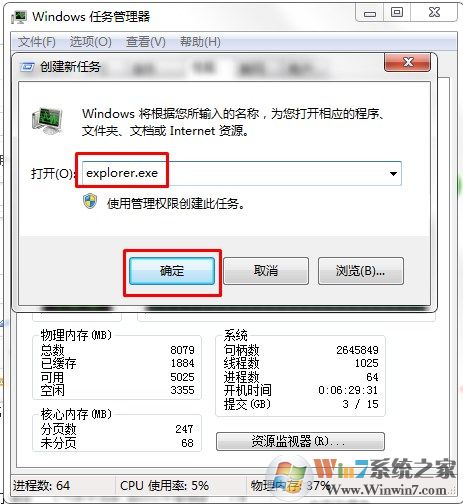 在彈出的“創(chuàng)建新任務”對話框中輸入“explorer”點“確定”,