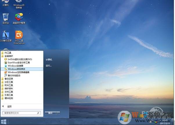 1、從U盤啟動后,進入WinPE。好了,點擊“開始”菜單→“所有程序”→“安裝維護”,開始進入“Windows密碼修改”模塊;