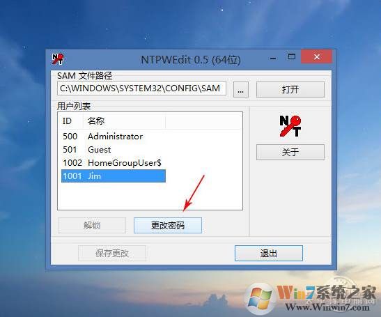 2、. 在這個界面下,點擊“打開”按鈕,軟件會首先列出系統(tǒng)中的所有用戶名,選擇你要破解的那個,然后點擊“更改密碼”按鈕即可;