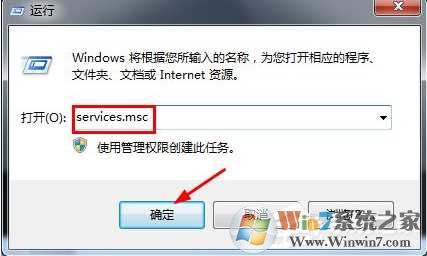 3、在運行框中輸入“services.msc”。然后點擊確定。