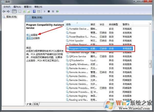 4、在出來的列表中,找到這個東東“Program Compatibility Assistant Service”。其實也就是程序兼容性助手的選項。點擊這個東東,在左側(cè)找到“停止”此項服務(wù),點擊停止即可。