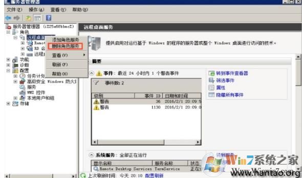 3.登陸成功后進入服務(wù)器管理器,在角色菜單中找到遠程桌面管理服務(wù)右擊刪除角色服務(wù)