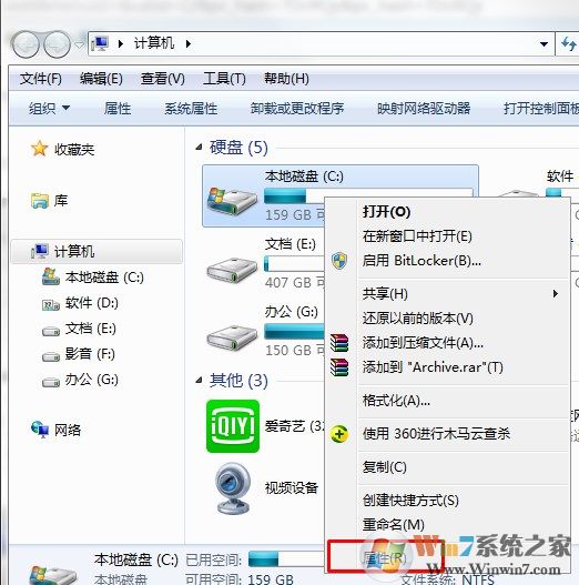 2、左鍵單機(jī)C盤,然后右鍵菜單選擇屬性