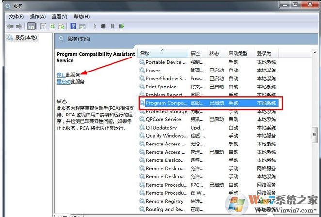4、在出來的列表中,找到這個(gè)服務(wù)項(xiàng)“Program Compatibility Assistant Service”。其實(shí)也就是程序兼容性助手的選項(xiàng)。點(diǎn)擊這個(gè)東東,在左側(cè)找到“停止”此項(xiàng)服務(wù),點(diǎn)擊停止即可。