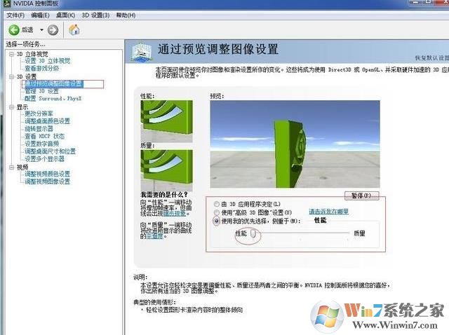 3、然后找到3D設(shè)置里面的“通過預(yù)覽調(diào)整圖像設(shè)置”將標(biāo)記放在性能上。