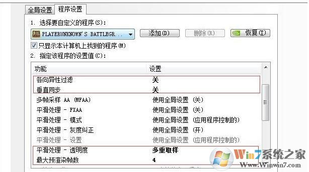 5、在這里朋友們可以看到有兩個設(shè)置,一個是全局設(shè)置、一個是程序設(shè)置,推薦大家使用程序設(shè)置,這樣的話除了吃雞更改了低配模式,其他的不會太乞丐。