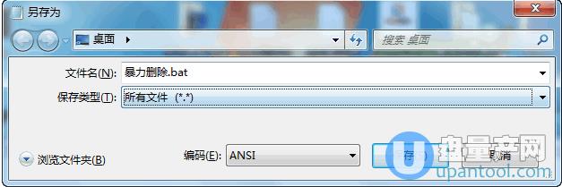 3、然后保存為 暴力刪除.bat文件,注意保存類型要選 所有文件,如下圖這樣,切記,填好后點(diǎn)保存即可。