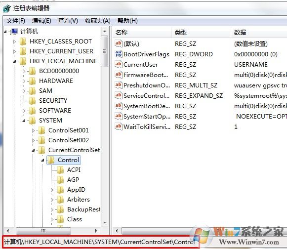 3、找到HKEY_LOCAL_MACHLNE/SYSTEM/CurrentControlSet/Control