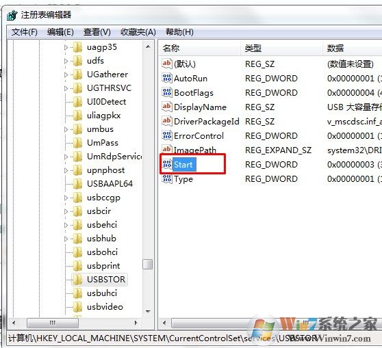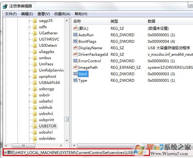 3、在注冊表中找到[HKEY_LOCAL_MACHINE\SYSTEM\CurrentCntrolSet\Services\USBSTOR]