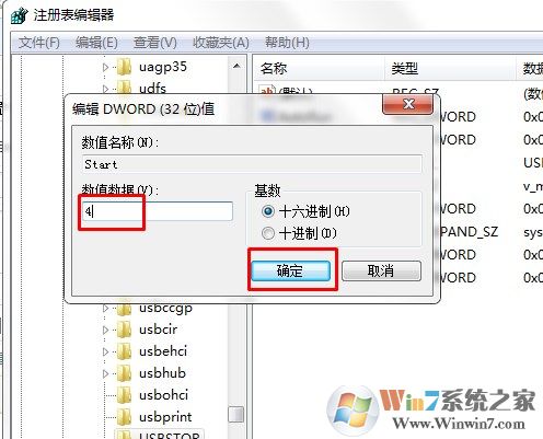 5、在彈出的編輯對話框中將其數(shù)值數(shù)據(jù)修改為十六位進制數(shù)值“4”。點“確定”按鈕并關(guān)閉注冊表編輯器