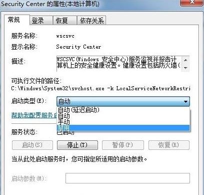 4、然后進入SecurityCenter服務(wù),找到該服務(wù)項,然后將該服務(wù)項設(shè)置為禁用,如圖所示: