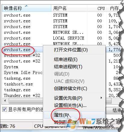 2、右擊某一Svchost.exe程序在彈出的菜單中選擇“屬性”