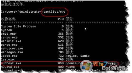 6、大家還可以在“運(yùn)行”對話框中(快捷鍵win+R)中輸入CMD。在其窗口中輸入“tasklist/svc”指令,回車后,你會看到如圖列表,如果在svchost.exe進(jìn)行顯示“暫缺”,那中毒的可能性也很大。