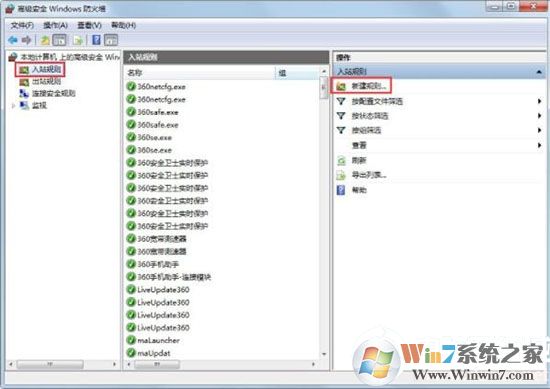 4、點擊入站規(guī)則,選擇右側(cè)的新建規(guī)則,如下圖所示;