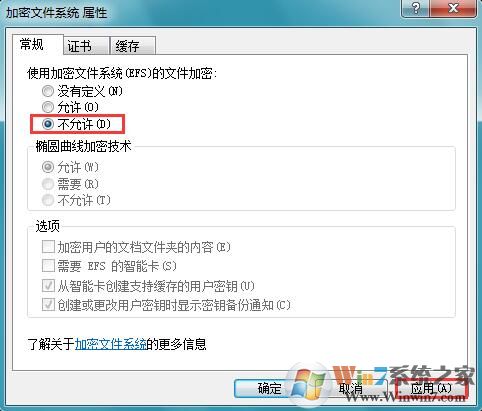 3、 在“常規(guī)”標簽頁中,將“使用加密文件系統(tǒng)的文件加密”設(shè)置為“不允許”,再按“確定”保存設(shè)置。
