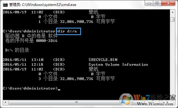 3、也可以輸入“dir d:/a”查看d盤所有文件,包括隱藏與未隱藏的文件,如圖所示: