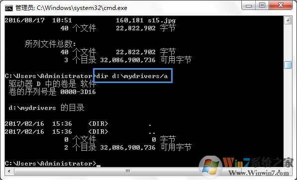 6、查看某個文件夾的所有文件的話,則在磁盤于命令參數中間加上“\文件名”,例如查看d盤中的mydrivers文件夾,在命令提示符輸入“dir d:\mydrivers/a”并按回車執(zhí)行,如圖所示: