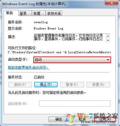 win7系統(tǒng)寬帶連接提示錯(cuò)誤1717如何解決?  2、雙擊打開(kāi)“Windows Event Log”服務(wù),將啟動(dòng)類(lèi)型修改為“自動(dòng)”——點(diǎn)擊“應(yīng)用”—點(diǎn)擊“啟動(dòng)”——點(diǎn)擊"確定"即可解決。