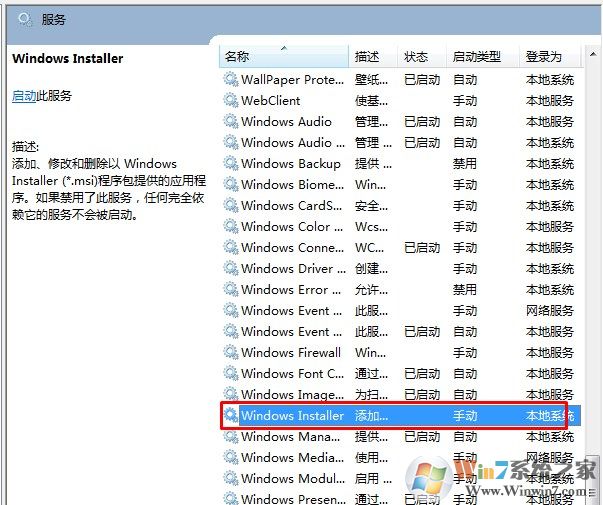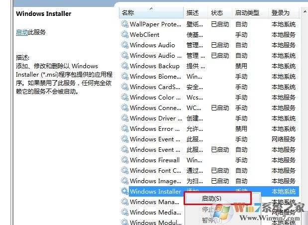 5、找到“Windows Installer”,右鍵選擇“啟動(dòng)”并等待服務(wù)啟動(dòng)。