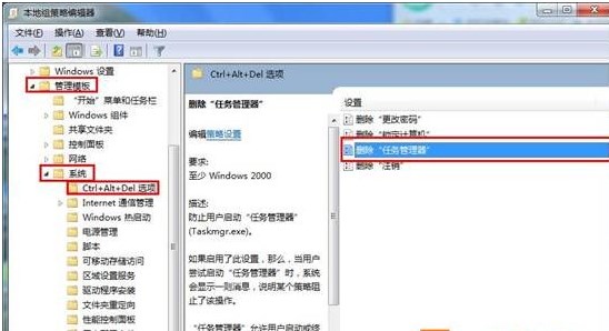 2、這時(shí)我們就進(jìn)入到策略組中了,我們?cè)凇居脩?hù)配置】——【管理模板】——【系統(tǒng)】——【Ctrl+ATL+DEL】選項(xiàng)下找到“刪除任務(wù)管理器”;