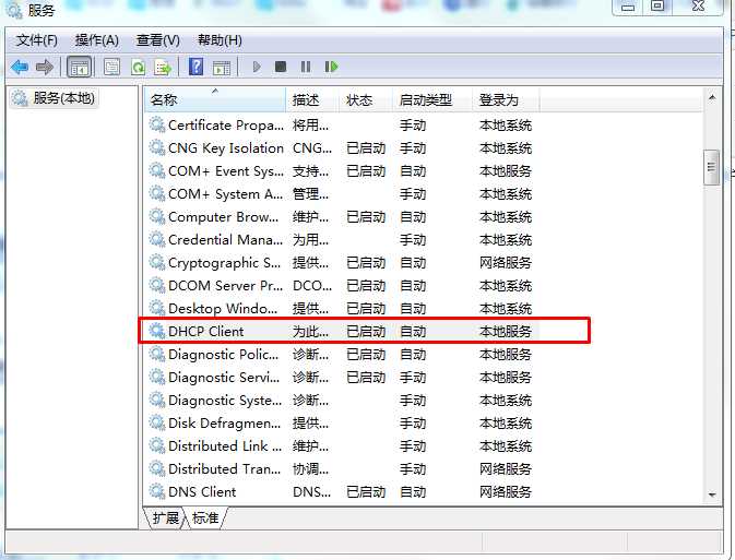 1、按下WIN+R,然后在運行中輸入 services.msc 回車,然后在服務(wù)中找到DHCP Client服務(wù);