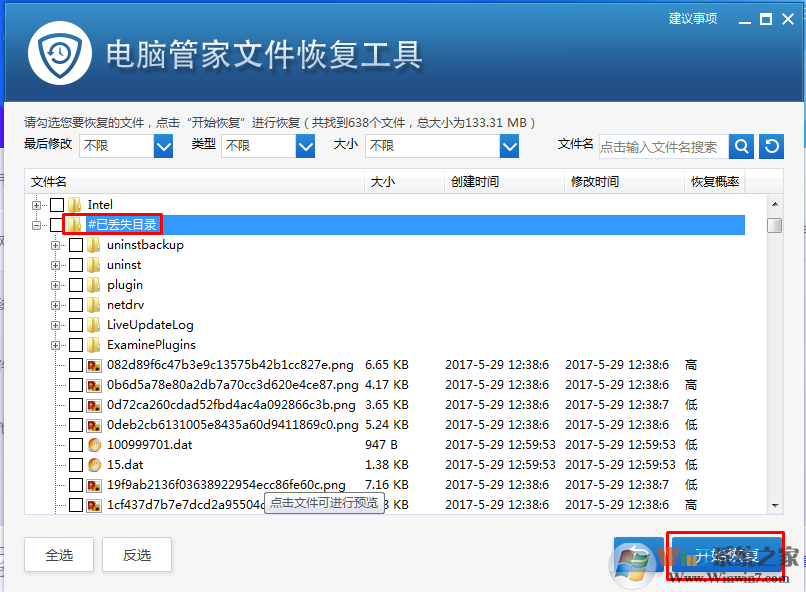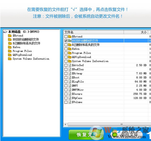 10、待完成盤符的掃描操作后,將顯示盤符中已刪除的所有文件,如果想恢復(fù)某一文件或文件夾,只需要勾選對應(yīng)的文件即可,點擊“恢復(fù)文件”按鈕即可完成相關(guān)已刪除文件的恢復(fù)操作。
