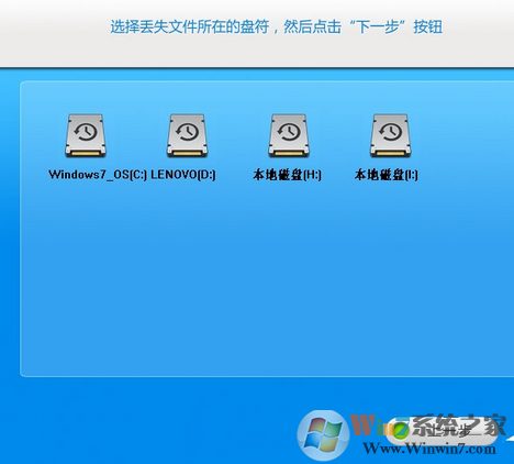 9、接下來將顯示“盤符”選擇界面,從此界面中選擇被刪除文件所在的盤符,點擊“下一步”按鈕