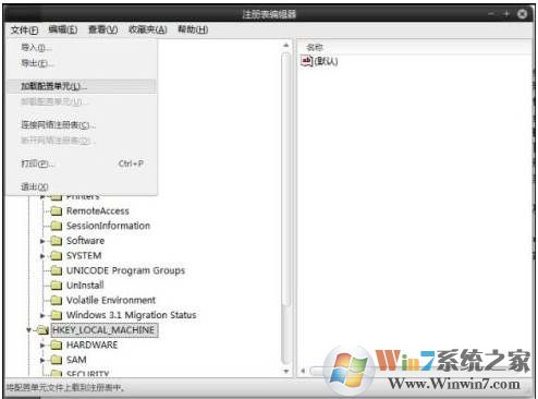 3、此時我們打開的是PE的注冊表,沒關(guān)系找到HKEY_LOCAL_MACHINE并左鍵單擊使其高亮,再點擊任務(wù)欄中的文件選擇“加載配置單元”