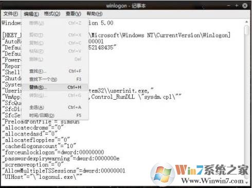 7、現(xiàn)在我們來討論下如何進行備份或者已導(dǎo)出注冊表信息的導(dǎo)入,正如本人情況winlogon項目下子項頗多,不可能照著注冊表信息逐條輸入,而直接導(dǎo)入的話項目名稱又不對(之前已經(jīng)把項目名稱改為“111”了)因此可以如下操作,以SOFTWARE為例,假如之前選擇了SOFTWARE 作為加載的配置單元并將其項目名稱定為111,可以用記事本打開已經(jīng)備份或者導(dǎo)出的注冊表信息文件,點擊任務(wù)欄里的編輯選擇替換