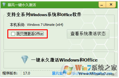 2、將我只想激活office勾選。由于暴風(fēng)激活工具屬于新的激活工具,還沒(méi)有完全經(jīng)過(guò)各大殺毒軟件的檢測(cè),為了廣大用戶的激活成功率,最好先關(guān)閉電腦上的殺毒軟件!