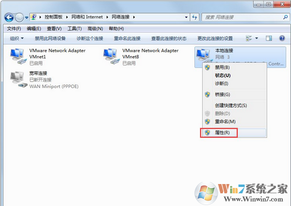 1、右擊“本地連接”,從彈出的菜單中選擇“屬性”項(xiàng);