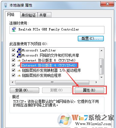 2、接著選中“TCP/IP”項(xiàng),并點(diǎn)擊“屬性”按鈕;