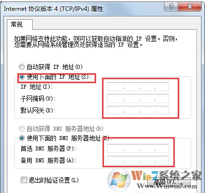 3、在打開的窗口中,勾選“手動(dòng)設(shè)置IP地址”和“手動(dòng)設(shè)置DNS”項(xiàng),并進(jìn)行設(shè)置。然后就可以正常上網(wǎng)啦。對于DNS的獲取方法,請查看下面的內(nèi)容。