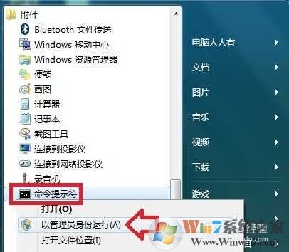 1、開始→所有程序→附件→右鍵點(diǎn)擊命令提示符(CMD)→以管理員身份運(yùn)行m.cncxm.com