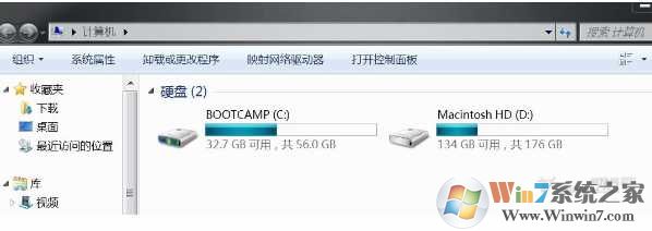 4、刪除后,再打開(kāi)win7的計(jì)算機(jī),就不會(huì)看到Macintosh HD磁盤(pán)分區(qū)了,也就隱藏起來(lái)了,如果要恢復(fù),我們?cè)僦付ㄒ粋€(gè)驅(qū)動(dòng)器號(hào)即可。